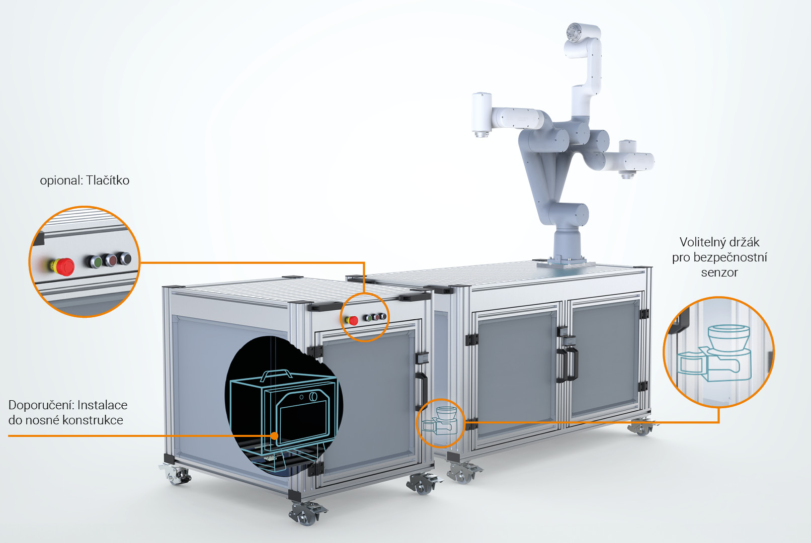 V nosné konstrukci je dostatek místa pro nejběžnější řízení Cobotů. Ta jsou také snadno dostupná přes dveře. Na otevřené profilové drážky pracovní plochy lze namontovat specifické komponenty, jako jsou držáky pro programovací panely, držáky obrobků, nástroje atd. Dodatečně si uživatel může namontovat i tlačítka nebo snímače.