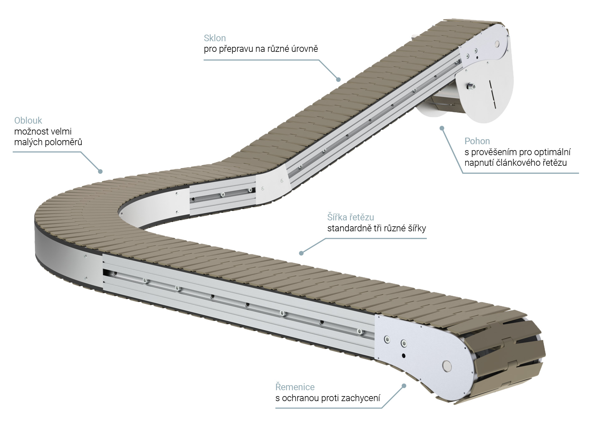 Naše řetězové dopravníky jsou velmi univerzální: lze je použít jak v cyklickém, tak v akumulačním provozu nebo v jiných řešeních na klíč, která se již osvědčila u našich pásových, modulárních dopravníků a dopravníků s ozubeným řemenem. Díky tomu vám můžeme nabídnout řešení na míru pro širokou škálu dopravních požadavků, což zaručuje efektivní a flexibilní dopravníkové technologie, které jsou přesně přizpůsobeny vašim individuálním potřebám.