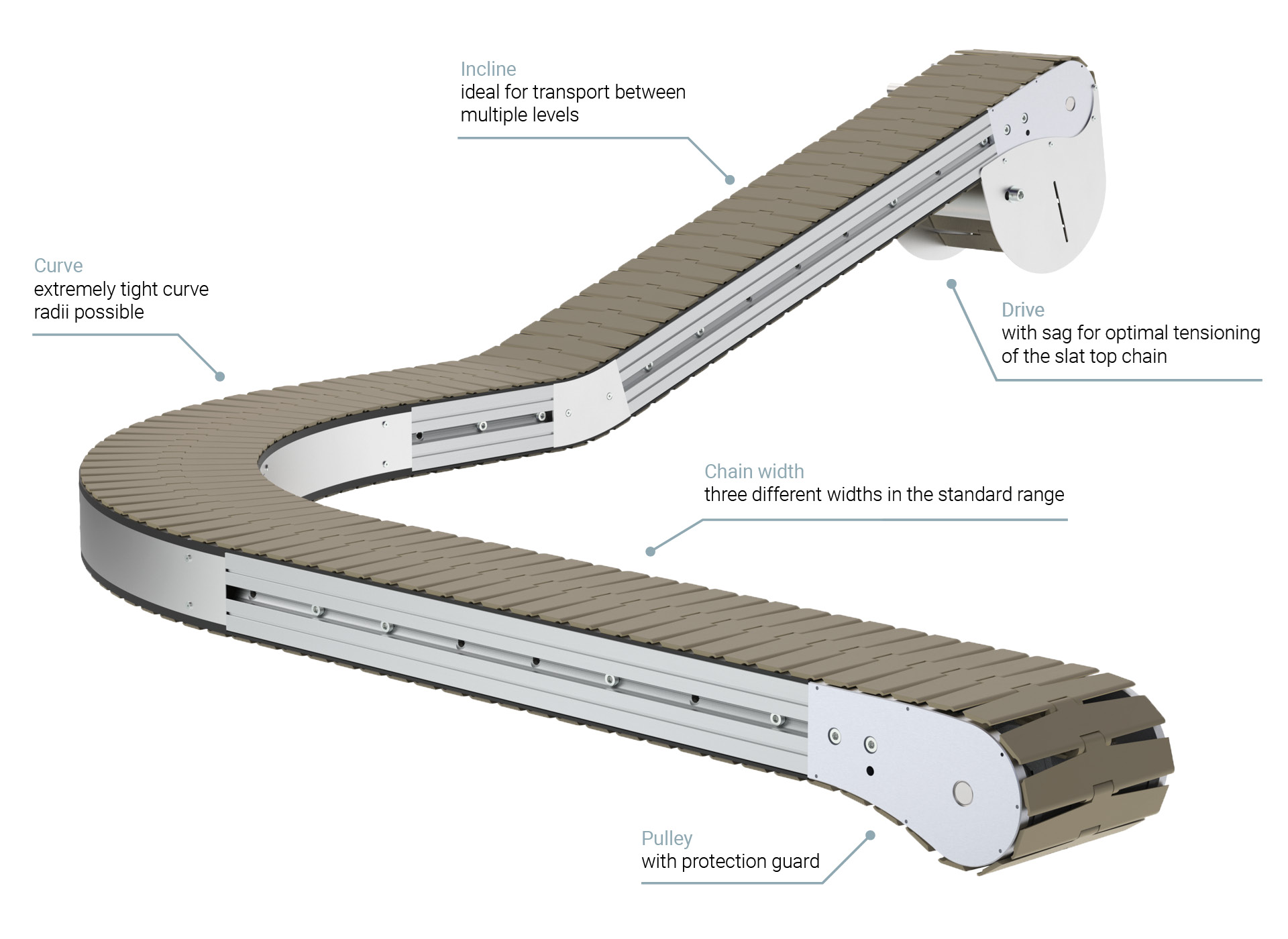 Discover the flexible and reliable solution for transporting materials over longer distances: Our Slat Top Conveyors are designed for complex layouts with multiple curves, making them ideal for industries such as packaging, logistics, food processing, waste management, and automotive manufacturing. Engineered for efficiency, durability, and minimal maintenance, these conveyors integrate seamlessly into your production and logistics systems. Their robust construction and versatile design ensure smooth workflows, greater productivity, and sustainable process optimization across a wide range of applications.