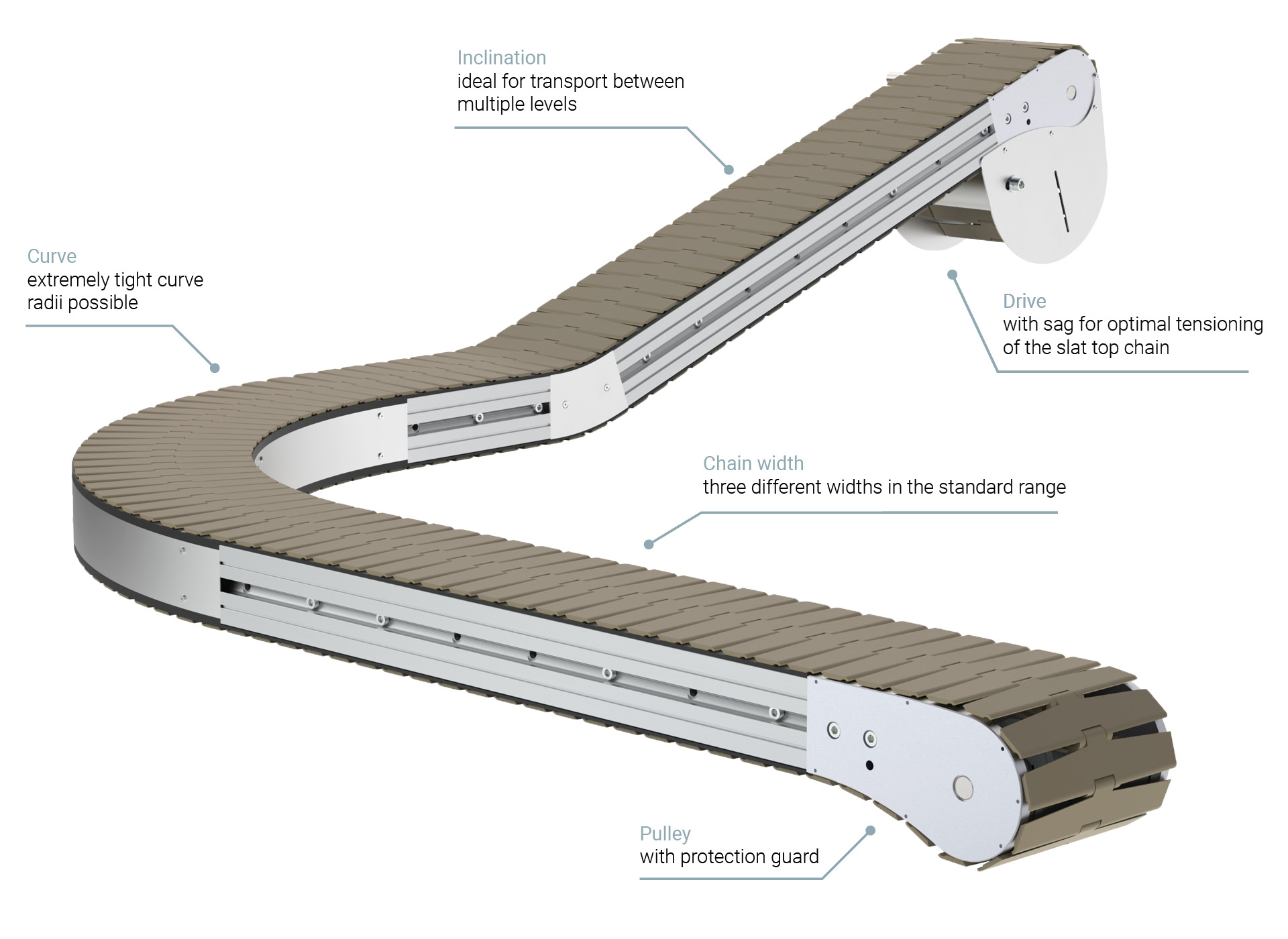 Robotunits' hinge chain conveyors can be easily adapted to your route layout, making them perfect for long distances with just one drive. Robust, reliable, and low-maintenance—for efficient, smooth processes in industry and logistics.
