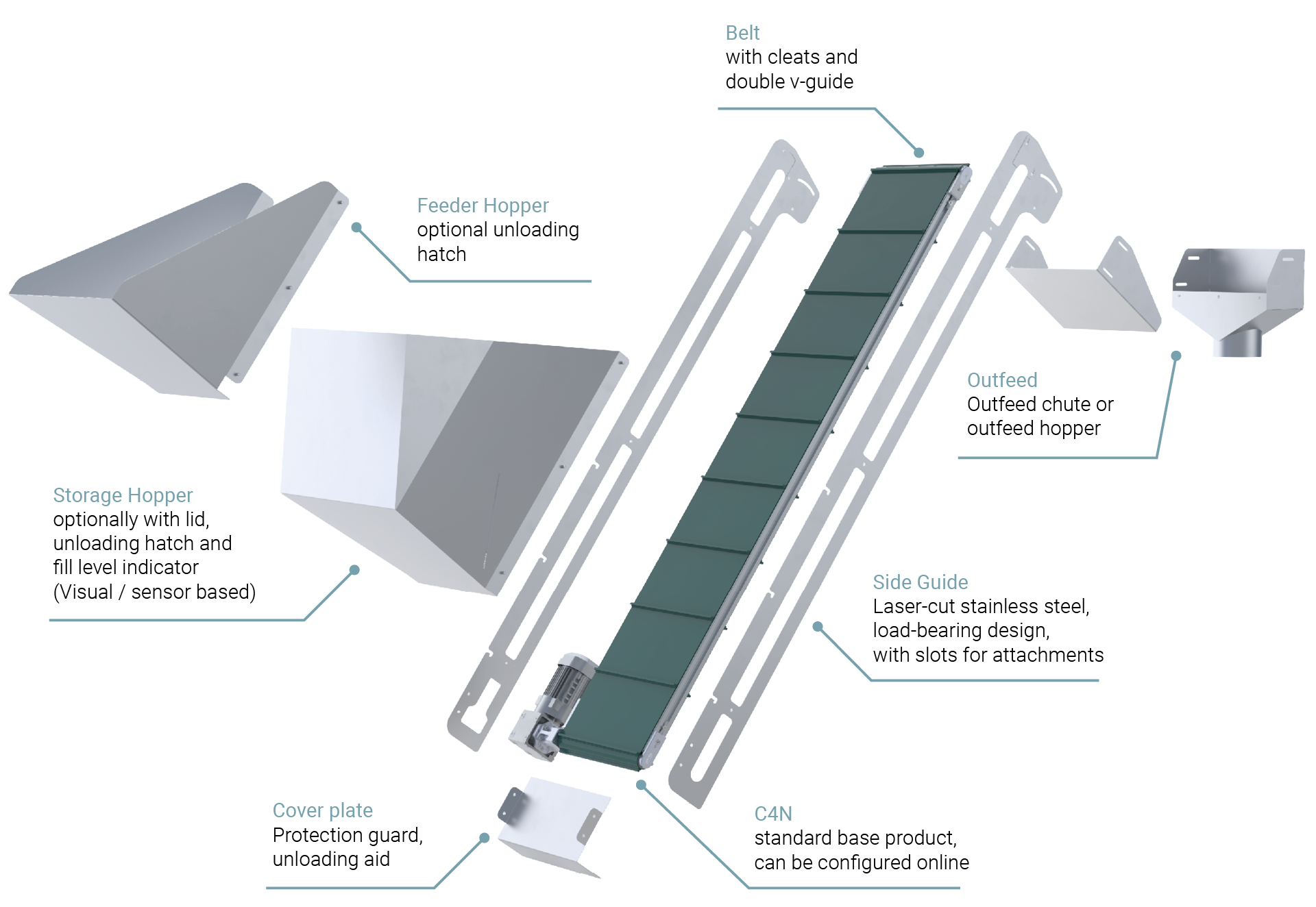 The Storage and Feeder Hopper Conveyors from Robotunits are the modular solution for the precise feeding of bulk materials and dimensionally stable parts. Based on our C4N belt conveyor, flexibly adaptable in height, width and incline - for fast and economical integration into your processes.