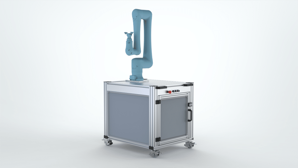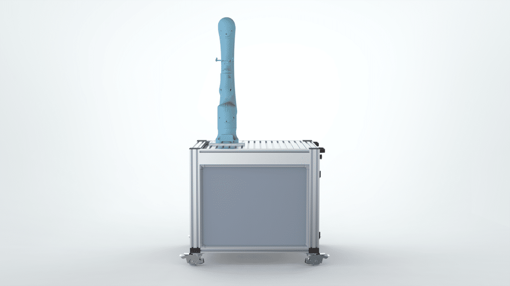 With the Cobot Station, machine operation, assembly, adhesive applications or simple pick & place tasks can be quickly tackled. Application-specific components such as tool holders, sensors or probes can be easily attached to the profile slots. Thanks to storage space for the control elements and lifting rollers with locking feet, the base ensures maximum mobility for individual application options.