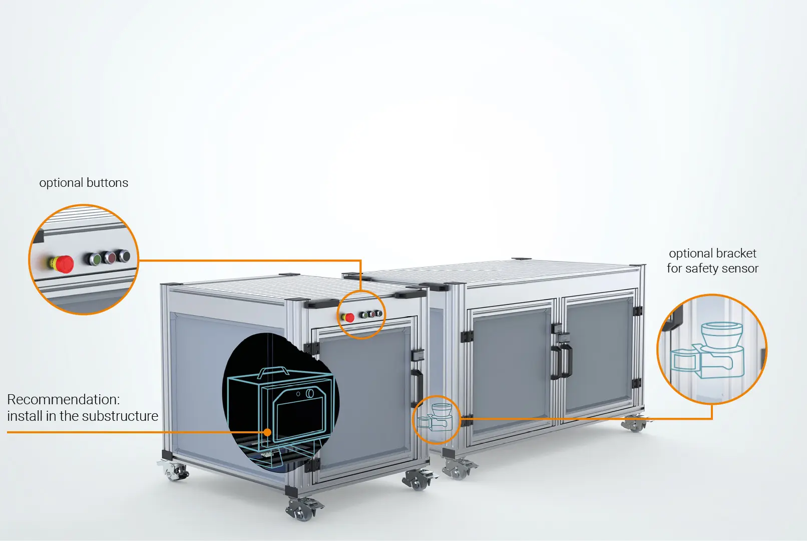 There is sufficient space in the substructure to accomodate the most common Cobot controllers. These are also easily accessible via the door. Application-specific components (such as holders for teach pendants, workpiece holders, tools, etc.) can be mounted to the open t-slots of the work surface. Push buttons or sensors can be subsequently mounted by the operator.