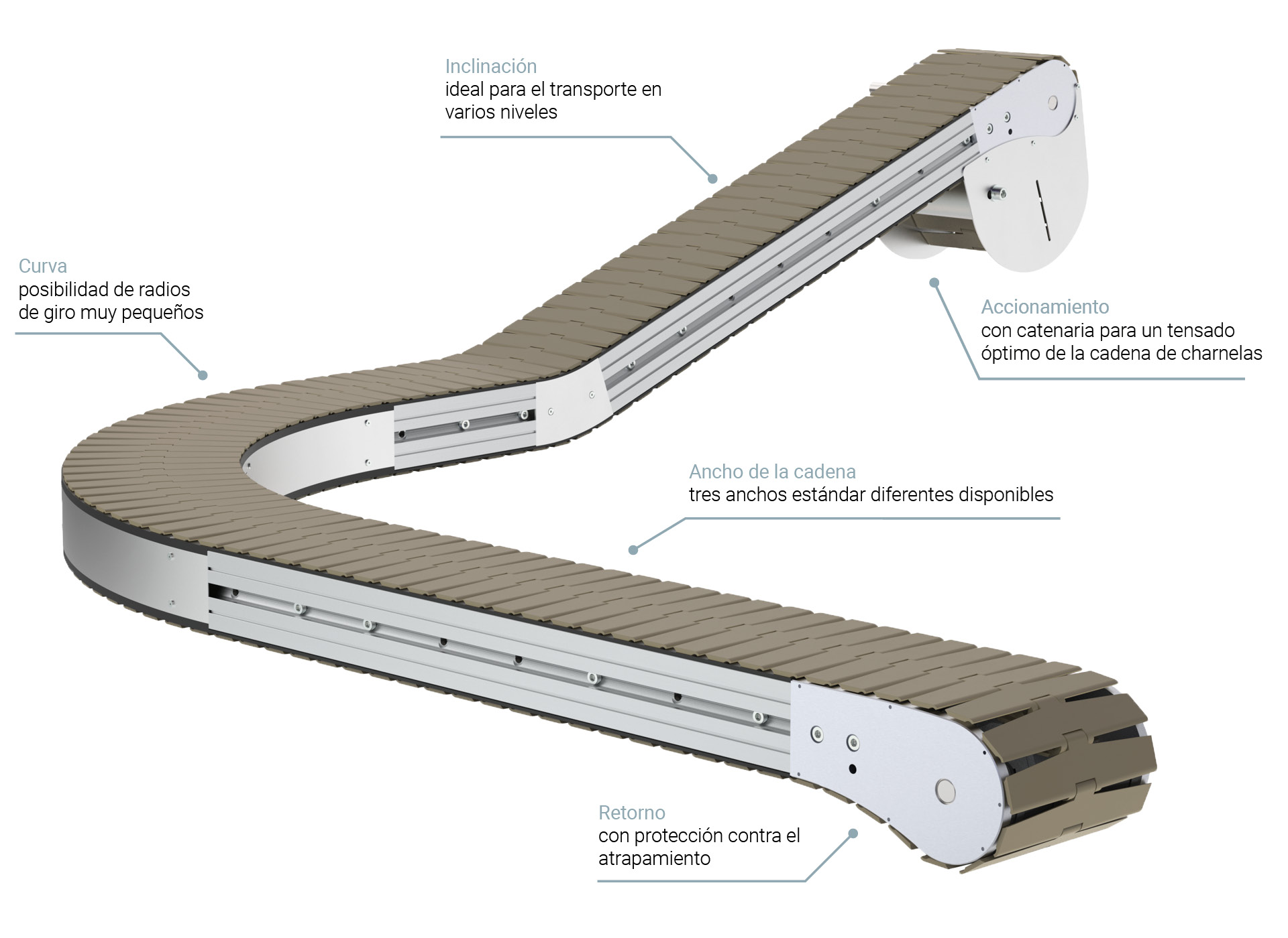 Los transportadores de cadena articulada de Robotunits se adaptan fácilmente al diseño de su recorrido, lo que los hace perfectos para distancias largas con un solo accionamiento. Robustos, fiables y con un mantenimiento mínimo: para procesos eficientes y fluidos en la industria y la logística.