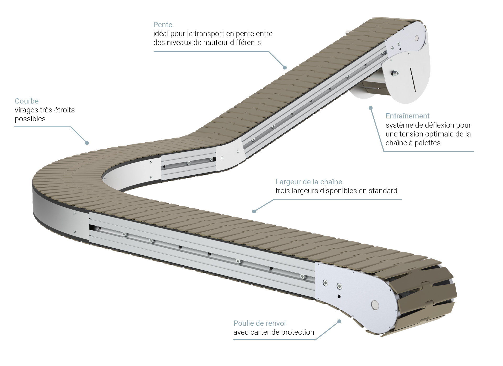 Nos convoyeurs à chaîne à palettes sont extrêmement polyvalents : en mode cadencé, en mode accumulation ou dans d’autres solutions clés en main qui ont déjà fait leurs preuves avec notre gamme de convoyeurs à bande, à bande modulaire et à courroie crantée. Nous vous proposons ainsi des solutions sur mesure pour les cas de transport les plus diverses et garantissons par là-même une technique de convoyage efficace et flexible, parfaitement adaptée à vos besoins individuels.