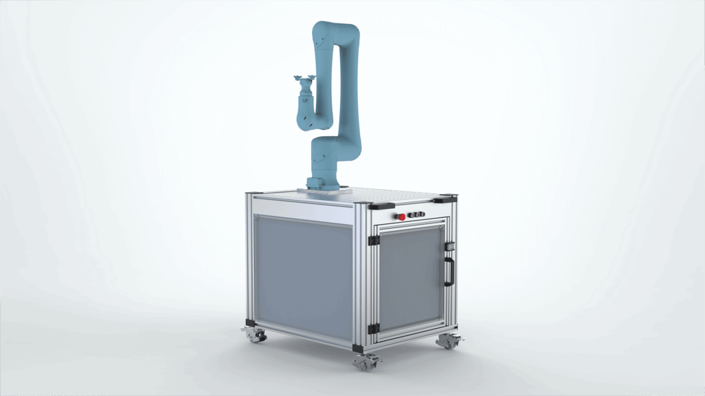 Nella sottostruttura c’è spazio sufficiente per sistemare i controlli più comuni per i cobot. Questi sono facilmente raggiungibili dalla porta. Le scanalature sul piano di lavoro facilitano l’applicazione di vari componenti, come i supporti per i Teach Pendants, i portapezzi, gli utensili, ecc. È anche possibile l’installazione a posteriori di pulsanti o sensori.Le ruote sollevabili rendono la sottostruttura mobile. Grazie ai piedini di bloccaggio integrati si puó fissare in modo stabile prima di rimettere la stazione in funzione.